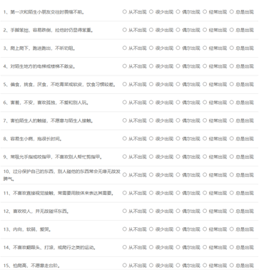 網(wǎng)絡(luò)線上測評(píng) 在線評(píng)估指的是通過作答網(wǎng)上給的測試題目,其中包括孩子的五感反應(yīng)靈敏程度、運(yùn)動(dòng)企劃能力強(qiáng)弱和交往能力高低等容易看出的表象來提交相應(yīng)問題的答案,再根據(jù)網(wǎng)上給出的相關(guān)答案信息來判斷孩子主要是哪些問題需要注意,以及可能存在的什么程度的感統(tǒng)失調(diào)。但是主觀選擇有時(shí)候難免有失偏頗。