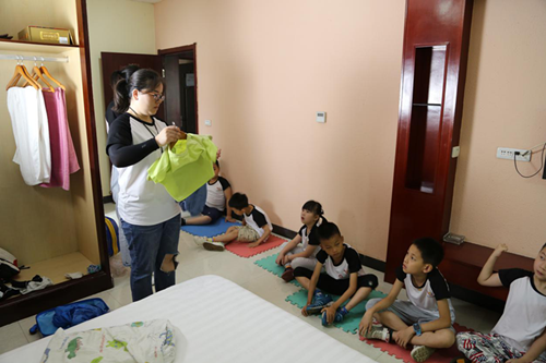 大巴抵達(dá)后,孩子們自行選擇室友,老師們安排好孩子們的房間,教孩子們安置好行李物品。 選擇室友時,瞿老師問蔣辰中小朋友:“你想跟誰住一個房間呀?”