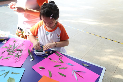 第四天, 孩子們都轉(zhuǎn)身投入自然的懷抱,在樹叢中探索大自然的奧妙,采摘奇特的樹葉,了解萬物神奇之處,完成屬于自己獨一無二的畫作。